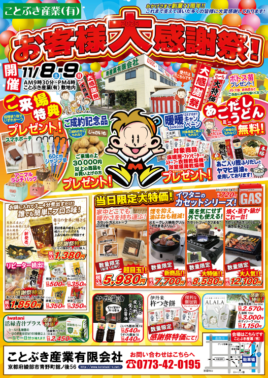 秋のお客様大感謝祭を開催いたします。当日はガス器具をはじめ、あご入り鰹ふりだしなど大特価にて販売いたします。今年はあご出汁を使用した、ミニうどんを無料でご用意しております。たこ焼き、焼き鳥などのキッチンカーもやってきます!ぜひ当日お越しください!