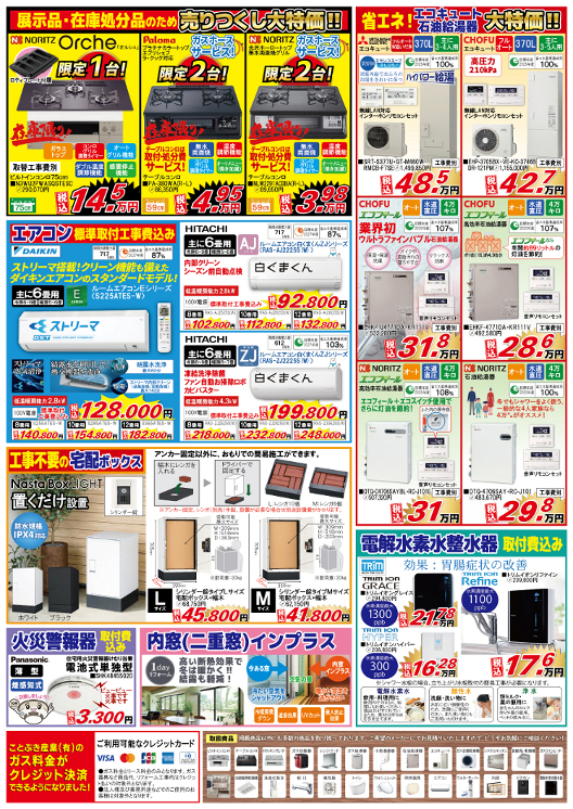 ビルトインコンロとレンジフードお得なセット販売や、ガス衣類乾燥機の乾太くん、ガス炊飯器などチラシ掲載商品に限り大特価となっております。5月末日までセール期間となりますので、ぜひご利用ください!